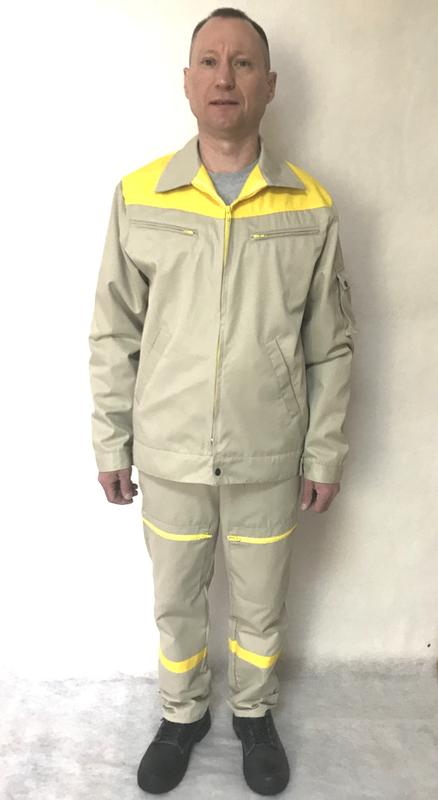 Костюм состоит из куртки и брюк. Для пошива используется ткань грета состав 47 х/б 53 полиэстер. Цвет ткани изделия может менять по желанию заказчика.