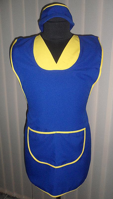 Одежда для продавцов, фартук перекидной с козырьком, синего цвета с желтой вставкой