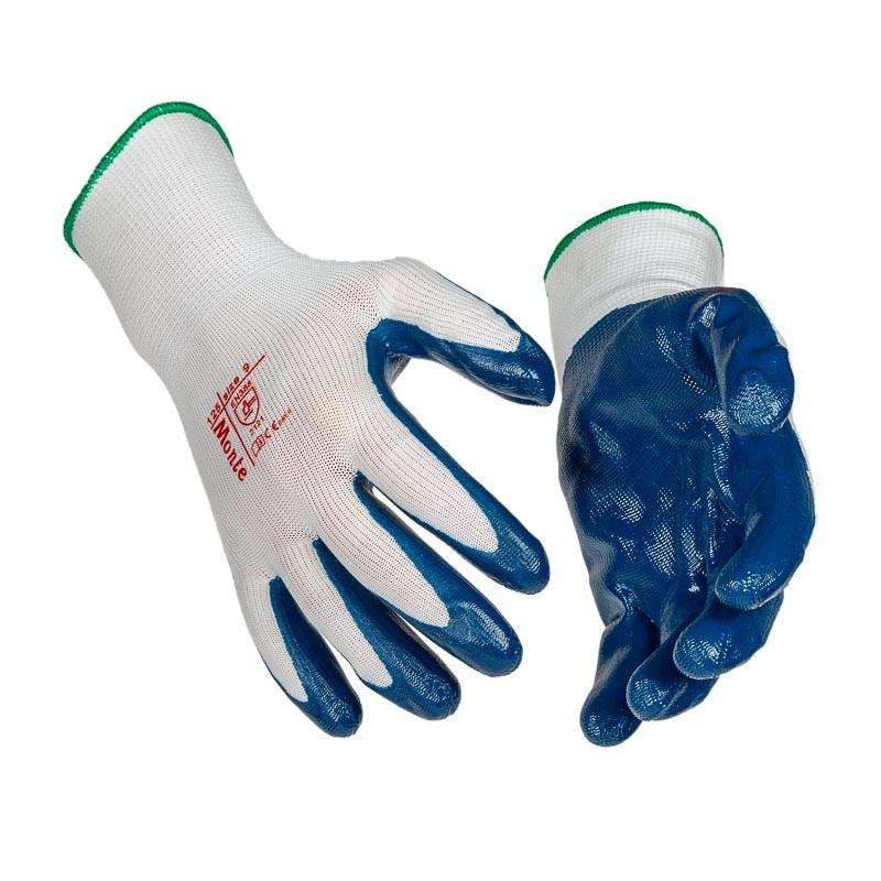 Захисні рукавиці 125 Monte. Артикул: PRDA-0125. - Поліамідні рукавички, долоні і пальці з нітриловим покриттям; - манжети трикотажні; - гарний захист від механічних пошкоджень; - хороше зчеплення із поверхнею; - призначені для друку, автомобільної промисловості при роботі з мастилами, нафтопродуктами, у дрібних роботах при складанні та сортуванні деталей, де необхідна підвищена чутливість. Матеріал: поліамід, нітрил; стандарти: CE EN ISO 420, EN 388/2121; категорія захисту: II.