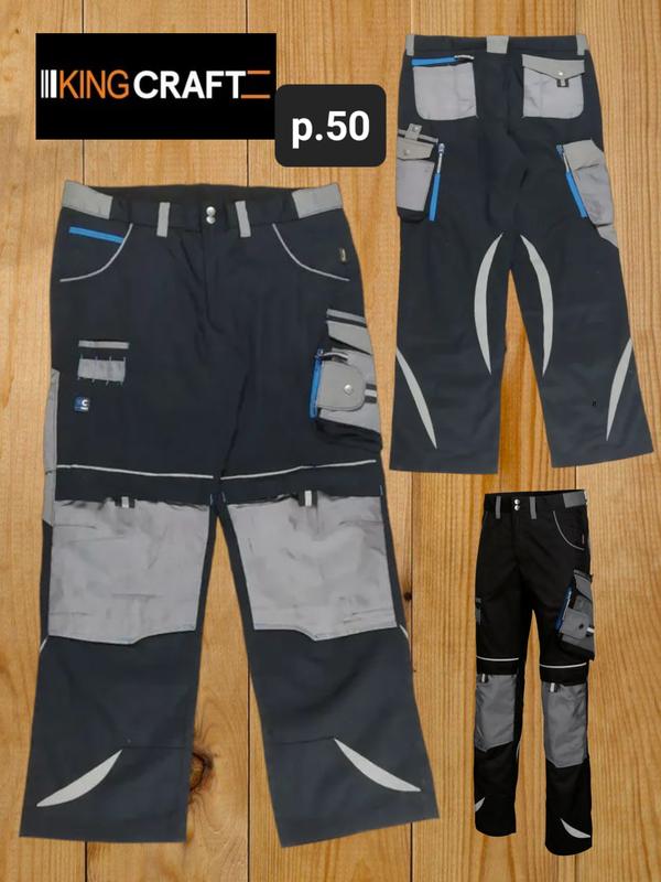 Мужские рабочие брюки на подкладе King craft (EUR 50) со светоотражающими полосами, состояние хороший щадящий пятна (правая верхняя часть, на фото видно). Д.по бічному шву- 106 см/ Д. по кроковому -79 см П.О.Т. 46 см-есть возможность уменьшить с помощью пуговиц на резине) П.О.С. 54 см. Высота посадки сперела -31см, сзади 38 см.