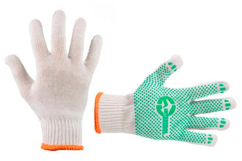 Перчатки хлопчатобумажные SP-0126 трикотажные белого цвета. На ладони нанесено ПВХ-покрытие, обеспечивающее защиту рук и надежный захват предметов. С эластичными манжетами, мягко прилегающими к кисти и предотвращающими попадание бытового и строительного мусора внутрь перчаток. Благодаря х/б основе обеспечивается свободный воздухообмен. Предназначен для выполнения строительных и сельскохозяйственных работ, ручных механосборных работ. Размер: 10"; Манжет: вязаный с окантовкой; Покрытие: ПВХ точки на ладони