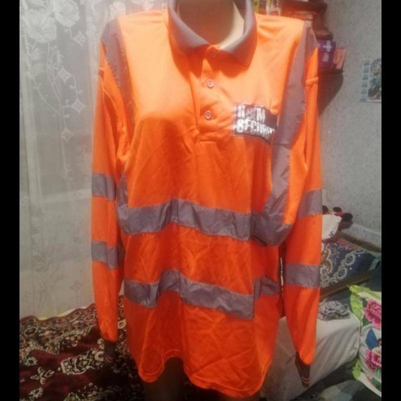 Светоотражающие поло от Portwest. Поло с длиным рукавом и воротником -манжетом. Застег на три пуговицы.На рукавах-манжеты.оранжевого цвета с люминесцентными полосками.Сзади и на груди эмблема Security.Размер указан XL.Состояния отличное.Состав:100%полтэстер. Замери:ПОГ-60см;ПОниза-64см;ПЛЕЧИ-51см; РУКАВ-62см;ДЛИНА-70см. Фото на теле нет. Пересылка.