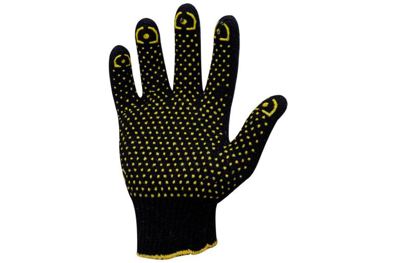 Перчатки хлопчатобумажные SP-0138 черного цвета. На ладони нанесено ПВХ- покрытие, обеспечивающее защиту рук и надежный захват предметов. С эластичными манжетами, мягко прилегающими к кисти и предотвращающими попадание бытового и строительного мусора внутрь перчаток. Благодаря х/б основе обеспечивается свободный воздухообмен. Предназначено для выполнения строительных и сельскохозяйственных работ, ручных механосборных работ. Размер: 10"; Манжет: вязаный с окантовкой; Покрытие: ПВХ точки на ладони