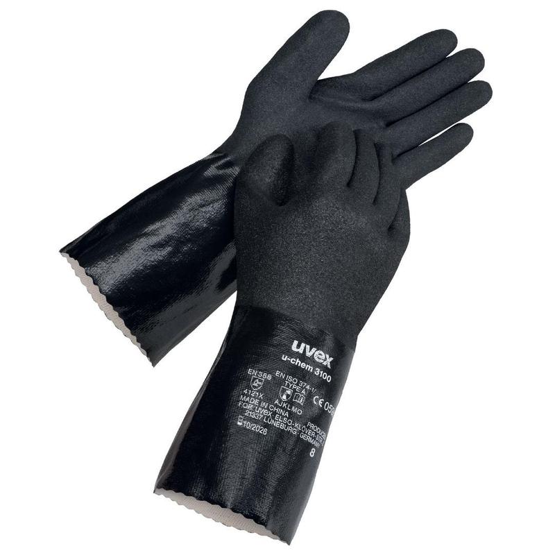 uvex ю-хим 3100 - идеальное сочетание химической защиты и сцепления - очень хорошая механическая защита - хорошо подходит - хорошая стойкость ко многим химическим веществам - очень хорошее сцепление на мокром и масляном покрытии - очень высокая гибкость Области применения: - химическая индустрия - автоматизированная индустрия - металлообрабатывающая промышленность - машиностроение, пескоструйная обработка Дизайнерская манжета, полностью покрытая Стандарт EN 388 (4 1 2 1 X), EN ISO 374-1:2016/Тип A (AJKLMO) - Материал хлопок (бесшовный) - Покрытие полностью покрыто специальным покрытием NBR (нитрильный каучук), около 0,50 мм - Пригодность хорошая стойкость к жирам, минеральным маслам и многим химическим веществам - Цвет черный