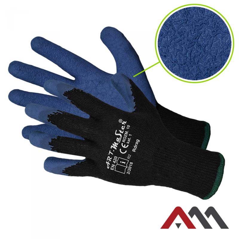 Перчатки защитные Artmsa Rdrag Перчатки защитные, трикотажные, утепленные, с латексным покрытием, синие, фактурные, бесшовные. - ### из трикотажа черного цвета, - ### в области ладони покрыта синим латексом, - ### латексное покрытие с шероховатой поверхностью, - ### обработанный рантом, - ### бесшовные Размер: 9, 10, 11 Art.MaSter ® - торговая марка. CE кат.1 EN 420: 2003 + A1: 2009 коллективная упаковка: 120/12 пар