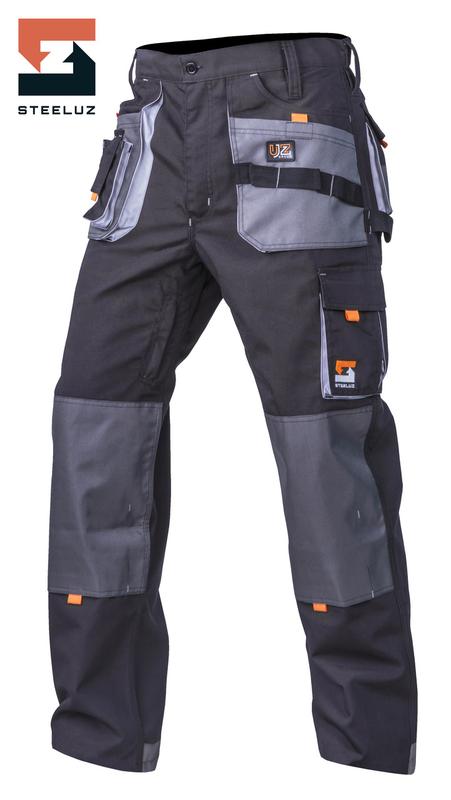 Многофункциональные рабочие брюки STEELUZ Брюки STEELUZ производятся из износостойкой сверхпрочной ткани CANVAS (плотность 273 г/м², состав: 65% - полиэстер, 35% - хлопок). Защитные усиливающие накладки из ткани OXFORD, плотностью 200 г/м², прочные накладки на коленях и по низу штанин - из ткани CORDURA, плотностью 223 г/м². Ткань имеет полотняное переплетение, что обеспечивает необходимую воздухопроницаемость и комфорт. Брюки выполнены в едином цвете "dark-grey", но с четырьмя цветовыми вариантами отделки контрастных элементов (красный, светло-серый, синий и салатовый). БРЮКИ STEELUZ: - эргономичный многофункциональный дизайн - 9 объемных карманов: из них 6 на липучке - для надежного хранения и быстрого доступа к смартфону, крепежу, инструменту - светоотражающие элементы - усиленные швы - пошаговый шов и шов сидения - высокопрочный тройной шов - 54 строчки-зигзаг (закрепки) повышают прочность нагруженных соединительных узлов - высокопрочные накладки из ткани OXFORD на карманах - суперпрочные, устойчивые к искрам, порезам и проколам накладки из ткани CORDURA на коленях и по низу штанин - разгрузка для инструмента - крепление для молотка - удобное кольцо для ключей - быстросъемное крепление для ременно-поясной системы - карманы для установки амортизирующих наколенников - вентиляция паховой зоны - ширина талии регулируется липучками ###