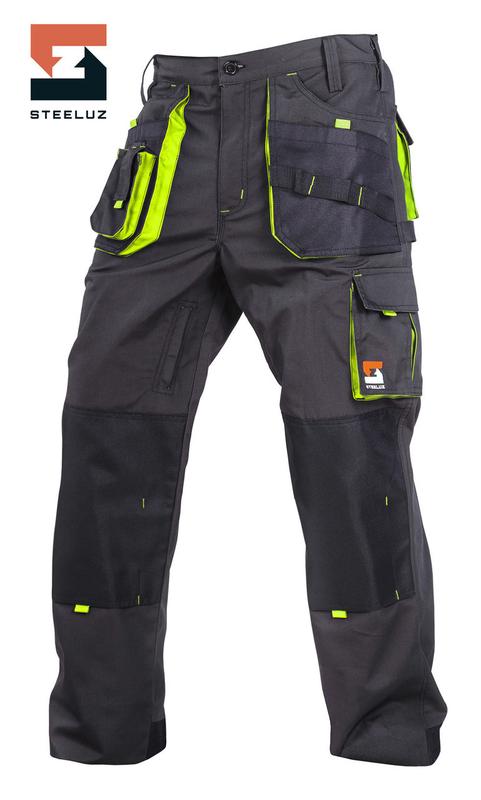 Брюки защитные рабочие SteelUZ Брюки STEELUZ производятся из износостойкой сверхпрочной ткани CANVAS (плотность 273 г/м², состав: 65% - полиэстер, 35% - хлопок). Защитные усиливающие накладки из ткани OXFORD, плотностью 200 г/м², прочные накладки на коленях и по низу штанин - из ткани CORDURA, плотностью 223 г/м². Ткань имеет полотняное переплетение, что обеспечивает необходимую воздухопроницаемость и комфорт. Брюки выполнены в едином цвете "dark-grey", но с четырьмя цветовыми вариантами отделки контрастных элементов (красный, светло-серый, синий и салатовый). БРЮКИ STEELUZ: - эргономичный многофункциональный дизайн - 9 объемных карманов: из них 6 на липучке - для надежного хранения и быстрого доступа к смартфону, крепежу, инструменту - светоотражающие элементы - усиленные швы - пошаговый шов и шов сидения - высокопрочный тройной шов - 54 строчки-зигзаг (закрепки) повышают прочность нагруженных соединительных узлов - высокопрочные накладки из ткани OXFORD на карманах - суперпрочные, устойчивые к искрам, порезам и проколам накладки из ткани CORDURA на коленях и по низу штанин - разгрузка для инструмента - крепление для молотка - удобное кольцо для ключей - быстросъемное крепление для ременно-поясной системы - карманы для установки амортизирующих наколенников - вентиляция паховой зоны - ширина талии регулируется липучками ###