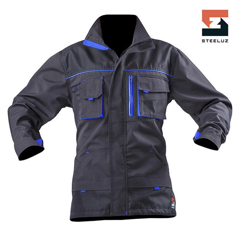 Куртка рабочая SteelUZ с синей отделкой Многофункциональная рабочая куртка STEELUZ Куртка STEELUZ производится из износостойкой сверхпрочной ткани CANVAS (плотность 273 г/м², состав: 65% - полиэстер, 35% - хлопок). Защитные усиливающие накладки из ткани OXFORD, плотностью 200 г/м². Ткань имеет полотняное переплетение, что обеспечивает необходимую воздухопроницаемость и комфорт. Куртка выполнена в едином цвете "dark-grey", но с четырьмя цветовыми вариантами отделки контрастных элементов (красный, светло-серый, синий и салатовый). КУРТКА STEELUZ: - эргономичный многофункциональный дизайн - 8 объемных карманов: из них 4 на липучке, 1 на молнии - для надежного хранения и быстрого доступа к смартфону, документам, крепежу, инструменту - светоотражающие элементы - усиленные швы - 30 строчек-зигзаг (закрепок) повышают прочность нагруженных соединительных узлов - высокопрочные накладки из ткани OXFORD на локтях, кокетке, спинке, карманах - усиленная центральная застежка на «тракторной» молнии с ветрозащитным клапаном - удобный воротник-стойка с клапаном для защиты подбородка от «тракторной» молнии - удлиненная спинка куртки для защиты поясницы от сквозняков - под рукавами - вентиляция зоны подмышек, регулируемая молнией - ширина по низу куртки регулируется липучками - ширина манжета рукава регулируется липучками ###