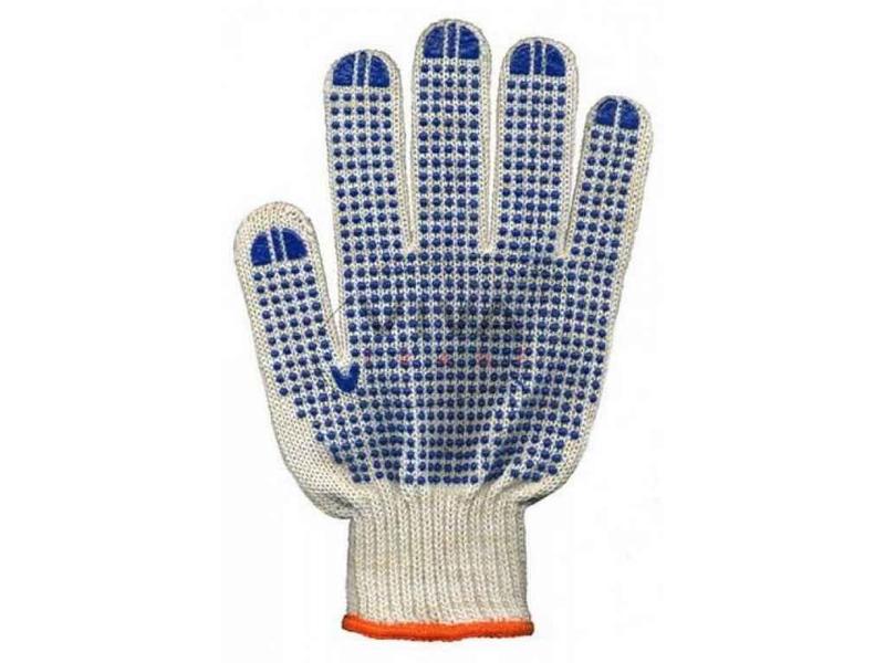 Перчатки рабочие 8410 белые с синей ПВХ капкой TOP в 4 нити 10р. ТМ VIVA TRADE Основное назначение: защита от грязи, пыли а также механических нагрузок, сельскохозяйственных работ. 70% хлопок, 30% полиэстер 10й клас вязки Плотность 220 ТЫХ г / км Вага пари 57 грам. Размер 10й