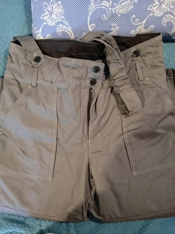 Классные темно серые из плотного материала. Два боковых кармана, шлейки которые можно снимать, низ штанины на смжке фиксируется пуговицей. Внутренние брюки черные утепленные - холлофайбер. Прищегиваются на пуговицах, можно снимать если потребуется. Замеры - д.104/68, пот 54 пояс широкий хорошо простроченный,. поб 63,. низ штанины 32, посадка 40/53. Не пожалеете. Оплата на картку . Укр., Нова пошта . Без возврата.