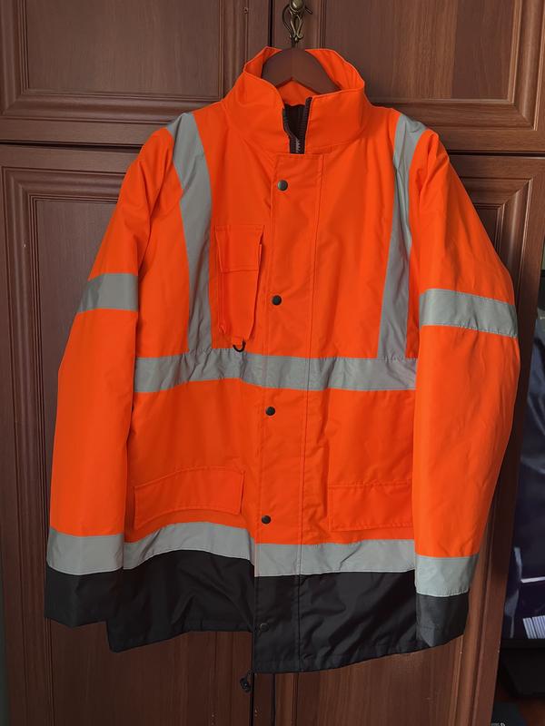 Зимняя рабочая куртка повышенной видимости (Hi-Vis). Тёплая, плотная, с утеплителем и капюшоном. Яркий оранжевый цвет и светоотражающие полосы обеспечивают отличную видимость в тёмное время суток и при плохой погоде. Подойдёт для строителей, дорожных рабочих, водителей, складов, охраны. Характеристики: — Утеплённая — Ветрозащитная и влагостойкая ткань — Светоотражающие ленты по корпусу и рукавам — Удобные карманы — Застёжка на молнию и кнопки — Капюшон Состояние: новая Подходит для осени и зимы