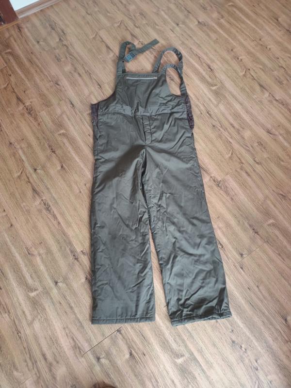 Комбинезон. утепленный. цвет хаки. Длина брюк до пояса 106см, шаг 82см, Победер 54см. Е карман сзади и сбоку. Застегуеться збоку на гудзики. Указан размер 54.