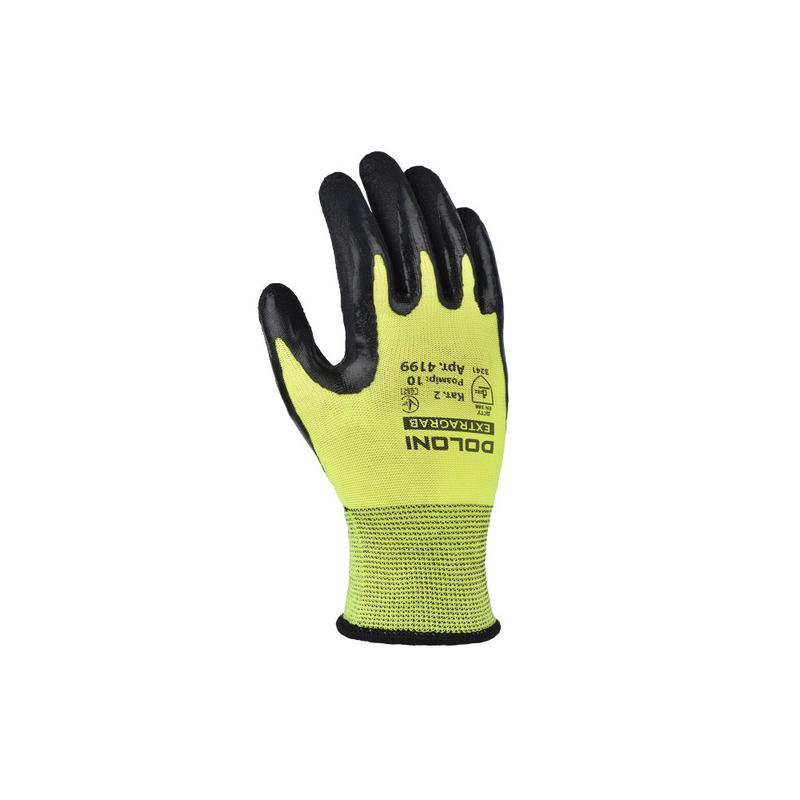 Doloni рукавички робочі 4199 серії Extragrab. Це рукавички трикотажні з латексним покриттям. Використовуються для роботи зі слизькими поверхнями. Латекс має властивість добре спінюватися, чим створює рельєфну структуру на рукавичці для запобігання ковзанню. Матеріал еластичний, тому рукавички міцні та не сковують рухи. Спеціальний манжет перешкоджає попаданню дрібного сміття всередину, тим самим захищає кисть. Такі рукавички з антиковзким покриттям дуже зручні при складальних та сортувальних роботах, при роботі з полірованими слизькими деталями та склом. Допоможуть захистити долоню від хімічних опіків. Увага! Латекс руйнується при взаємодії з тваринними, рослинними жирами та мастилами. Сфери застосування: - для малярних робіт; - для СТО; - у сільському господарстві; - для лабораторій; - у хімічній промисловості; - з листовим металом. Особливості моделі: - Матеріал: поліестер. - Рукавички з полімерним покриттям: латекс. - Площа облива: неповна облива. - Властивості: антиковзні. - Колір: салатовий.