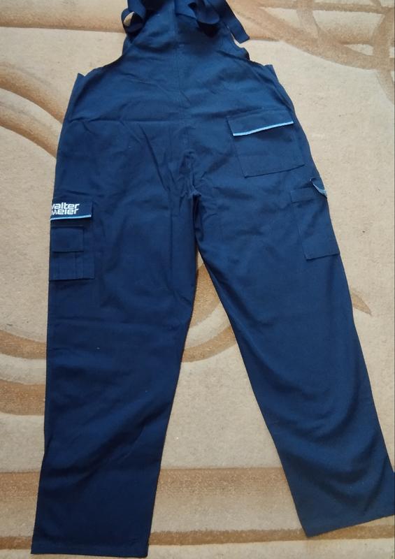 мужские рабочие брюки на шлейках, состояние новых, темно синие с голубыми вставками, имеет по бокам вставные резинки на поясе сбоку, чтобы легче было одолбить, тканевая 60% Baumwolle, 40% полиэстер