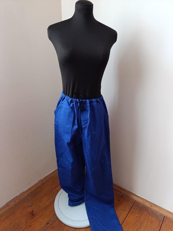 Брюки рабочие, из прочной плотной ткани. Зашпиливаются на пуговицы и шнуровку. Размер 46. Замеры: полуобхват талии 44, глубина 36, длина 110.