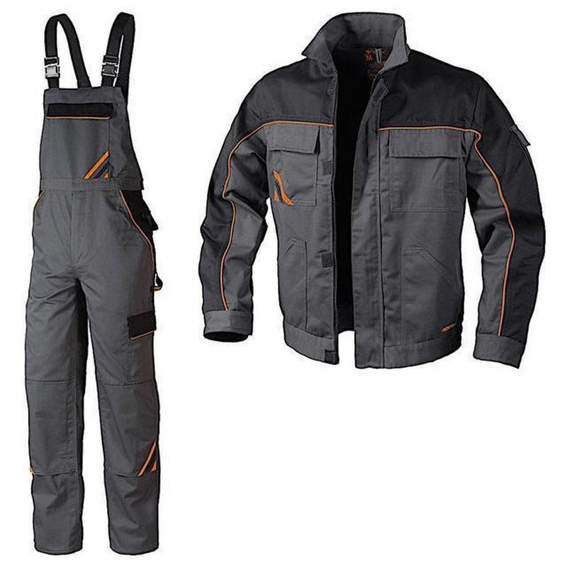 РАБОЧИЙ КОСТЮМ (СПЕЦОДЕЖДА) Изготовлен из очень прочной специализированной ткани 65% полиэстера и 35% хлопка с очень высокой плотностью 320 +/- 10 грамм / 1м2 и прочным, плотным переплетением. Куртка: - тройные и двойные швы, а также многочисленные сплошные болты, которые дополнительно укрепляют места, особенно подверженные разрыву - 5 карманов, в том числе 3 с клапанами на липучках - застегивается на молнию на липучке - возможность регулировки ширины рукава по манжете - низ толстовки отделан полосой с прорезиненной резинкой - очень низкая усадка даже после многократной стирки - стабильность цвета Полукомбинезон: Профессиональный комбинезон исключительно привлекательного дизайна и отличной функциональности. Изготовлен из очень прочной специальной ткани 65% полиэстера и 35% хлопка с очень высокой плотностью 320 +/- 10 грамм / 1 м 2 и прочным, плотным переплетением. - тройные и двойные швы, а также многочисленные сплошные болты, которые дополнительно укрепляют места, особенно подверженные разрыву - 2 пришитых кармана для наколенников, позволяющих использовать сменные наколенники - удобная и практичная система регулировки окружности талии - 6 карманов, дополнительный усиленный карман для меры - усиление на задних карманах - широкие подтяжки с тугой резиной и прочными пряжками - очень низкая усадка даже после многократной стирки - стабильность цвета Цвет: сталь с оранжевой и черной фурнитурой. ОПТ и розница, возможность покупки отдельно полукомбинезона. Цена указана на розницу (куртка+полукомбинезон). Размеры 46 – 64