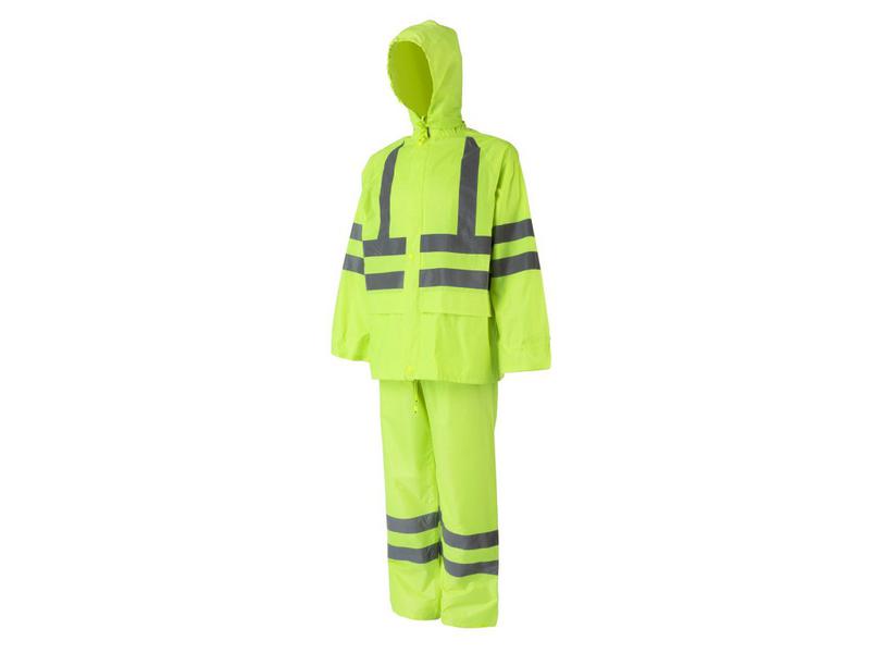 Влагозащитный костюм повышенной видимости. Особенности: - костюм изготавливается из ткани ярко-оранжевого и ярко-лимонного цветов. Имеет светооражающие полосы. Соответствует 3-му классу по ГОСТ Р 12.4.219-99 «Одежда специальная сигнальная повышенной видимости» - удобная конструкция: куртка с застежкой на молнии, клапаном против ветра, капюшоном, двумя карманами с клапанами, манжетами на рукавах. - ткань: костюм изготовлен из прочной плащевой ткани с ПВХ покрытием.Вес ткани — 225 гр./метр.кв. Вес костюма 1350 + 50 гр. Водоупорность ткани не менее 5000 мм водяного столба. Ткань экологична и соответствует европейскому стандарту по содержанию вредных веществ EN 71 PART3. - проклеенные швы: все швы костюма загерметизированы специальной лентой.