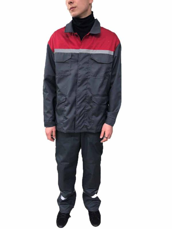 Костюм состоит из куртки и полукомбинезона. Куртка прямого силуэта с центральной застежкой на пуговицы, отложным воротником и втачными рукавами. На куртке размещены 2 верхний и 2 нижних накладных кармана с клапанами. Отрезная кокетка и светоотражающая лента на куртке и внизу штанины. Полукомбинезон прямой, с 2 накладными передними карманами, гульфик на пуговицах. Материал: грета, 53 % хлопок / 47 % полиэстер, плотность 220 г/м². Цвет: серый. Защитные свойства: МиЗ (защита от общих производственных загрязнений и механических воздействий). Отделка: ВО (водоотталкивающая). Размер 48-50