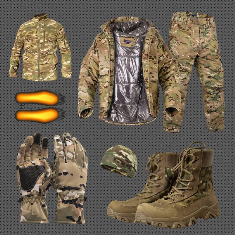 В комплекте: 1.Куртка зимняя Omni-heat termo 2.Штаны зимние Termo 3.Берцы зимние на меху масло / мульт 4.Перчатки зимние Soft-shell 5.Шапка флисовая мультикам 6.Кофта флисовая мультикам 7.Стельки с подогревом Termo