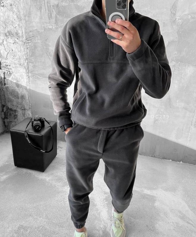 Серый мужской флисовый спортивный костюм, графитовый мужской флисовый спортивный костюм, ч...