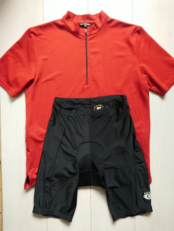Велокостюм в очень хорошем состоянии Размер L Футболка длиной спереди 73 см, сзади 46 В плечах 48 ПОГ 55 Материал полиэстр Велошорты длиной 51 см Крок 28 Посадка спереди 32 см, сзади 38 ПОП 32 см и тянется до 52 ПОБ 50 см и тянется до 70 Ширина штанки в низу 18 см и тянется до 30