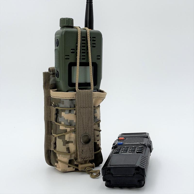 MELGO Radio Pouch Olive Чехол держатель под рации разных моделей Конструкция - Основной отсек с системой фиксации Molle на задней части. Фиксация - Рации разных производителей будут сидеть внутри плотно и не выпадать во время прыжков и амплитудных движений, за счет регулируемого шнура, который с помощью липучки и кнопки закрепляется на передней стороне подсумка. - Также регулируется ширина подсумка резинкой шнурком на передней стороне. Размеры - длинна 8 см - высота 14см - ширина регулируется от 2 до 4 см Используемые материалы - фурнитура WOOJIN - 100% нейлон - липучка Класс А - 100% нейлон - ткань Polycordura 900 D - 100% полиэстер 1. плотность - 320 г/м2 2. покрытие - 1 слой полиуретана