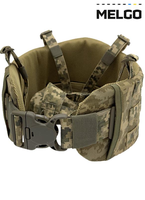 MELGO Tactical Unloading System Cordura 3D Pixel Ременно плечевая система разгрузки с 3D сеткой и интерфейсом Molle Размеры - М - на обхват пояса 86-101 см (длина основы пояса - 84 см, 3 ряда по 13 ячеек) - L - на обхват пояса 94-109 см (длина основы пояса - 92 см, 3 ряда по 16 ячеек) - XL - на обхват пояса 100-115 см (длина основы пояса - 99 см, 3 ряда по 18 ячеек) Конструкция - Пояс шириной 11,5 см, глубиной 12 мм с ячейками системы MOLLE для крепления подсумков. - Для равномерного прижима, вшита поясная ременная стропа шириной 5 см. - Плечевые лямки с центральной нагрудной застежкой и двумя ячейками для крепления небольших подсумков. - Данные плечевые ремни крепятся к поясу с помощью двухщелевых пряжек. - Центральная застежка пояса вшита в конструкцию. Фиксация - РПС фиксируется в области пояса. - Регулировка производится с помощью вспомогательных двухщелевых пряжек, позволяющих подогнать РПС по охвату. Внутренний уплотнитель - Внутри пояса находится материал ЭВА толщиной 10 мм, который укрепляет каркас и позволяет использовать достаточное количество навесного оборудования без перекручивания и деформации основания пояса. - При необходимости его можно заменить на баллистический пакет. Используемые материалы - фурнитура WOOJIN - 100% нейлон - ременная лента - 100% полиамид - резинка - 100% нейлон - липучка - 100% нейлон класса А - материал 3D сетка - 65% нейлон, 35% полиэстер - ткань: IRR Cordura 500 D 1. Состав: 100% нейлон 6.6 NILIT 2. Плотность м2: 230 г 3. Покрытие: 1 слой полиуретана (PU) 4. IRR (не видимость в ПНВ в а и в спектре как в обычном режиме так и с активным облучением) 5. Водоотталкиваемость: min.4 6. Износостойкость: min. 2800H по основе 7. Крепость на разрыв: min. 280H по основе