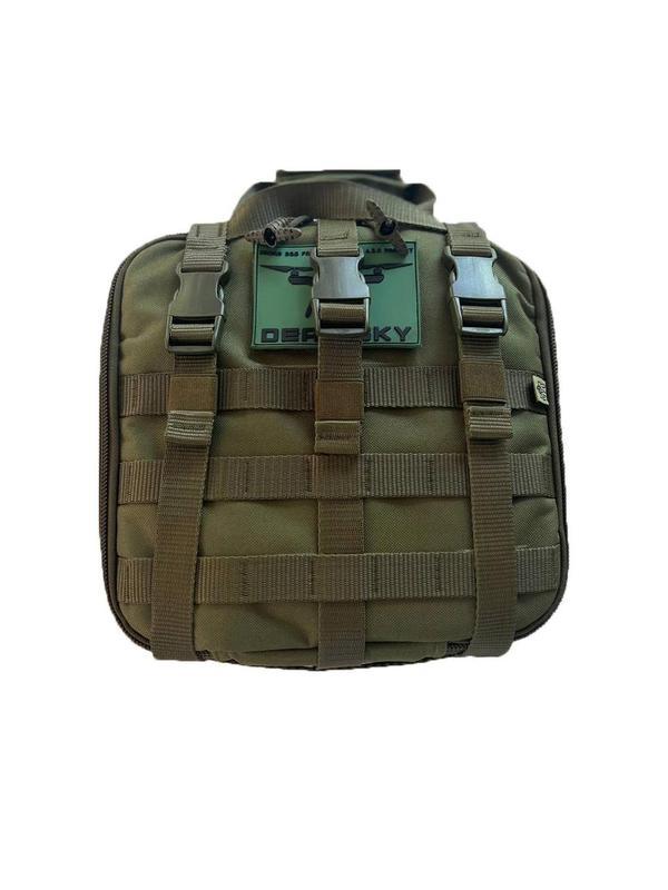 Тип спорядження: Підсумки Кілька примірників у наявності Матеріал - Cordura 1000D. Склад тканини -100% нейлон 6.6 NILIT Габарити сумки – 27см х 27см х 12,5 см . Габарити внутрішнього карману – 25 х 17 см Сумка призначена для зручного транспортування дрону та комплектуючих до нього під час виконання різноманітних завдань. З усіх боків зовні та в середині підсумок має бортовий ущільнювач, який дозволяє тримати форму, додає міцності від ударів і об'єм. Задня платформа оснащена системою MOLLE, що дозволяє кріпити підсумок на спорядження. Також сумка оснащена системою швидкого зняття. В комплекті із сумкою їде ремінь для транспортування на плечі або за спиною, максимальна довжина ременю 1,4м, довжина – регулюється. У середньому сумка розрахована на 9 акумуляторів (10 у дроні), пульт управління, дрон, систему скидання, додатковий відсік для дрібниць та кишеня для планшета/телефону. Конструкція внутрішніх відсіків забезпечує можливість індивідуальної комплектації для дрону. розмір: -