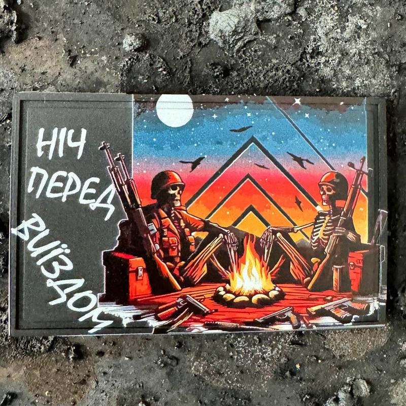 Шеврон «Ночь перед выездом». Материал пвх. Изображение нанесено уф печатью. Размер 50 мм на 80 мм.