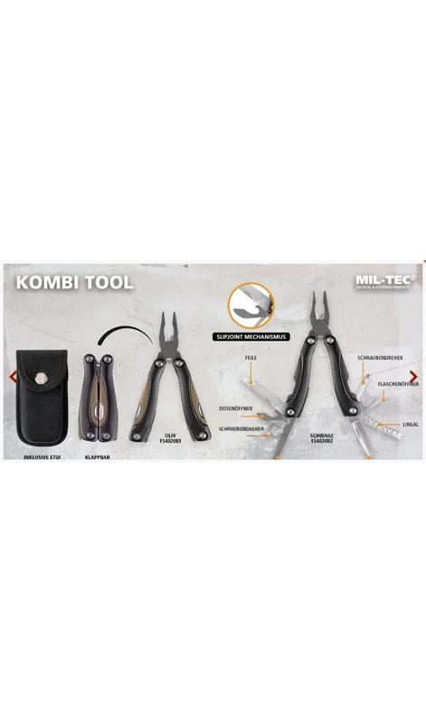 Мультитул Mil-Tec з чохлом KOMBI TOOL 9в1 Multitool Kombi виробництва німецького бренда Mil-Tec® -- це невеликий багатофункціональний інструмент для кожного шанувальника DIY, рибалки або шанувальника виживання. Ручки виготовлені з міцного АБС-пластику, інструменти з неіржавкої сталі 2Cr13. До комплекту також входить нейлоновий чохол. Все це упаковано в естетичну фірмову коробку, що робить мультитул ідеальним подарунком. Multitool Kombi -- це набір найчастіше використовуваних інструментів, які завдяки мінімальній вазі та розміру завжди можна мати біля себе. параметры: - Модель: Комбінований інструмент - 9 інструментів - Спеціальні аксесуари для виживання - Нейлоновий чохол Інструменти: сталь 2CR13 Чохол: 100% нейлон Вага: 240г Довжина в складеному вигляді: 10 см Загальна довжина: 15,5 см Розмір упаковки: 10 х 4,5 х 2 см Ручка: ABS/Алюміній Інструменти: - плоскогубці з кусачками - ніж - 2 викрутки (плоска, хрестова) - консервний ніж - відкривачка для пляшок - лінійка - пильний диск Особливості: - Інструменти можна розкласти однією рукою; - Інструменти з механізмом ковзання; - У комплект входить чохол. Бренд: Mil-Tec, Німеччина