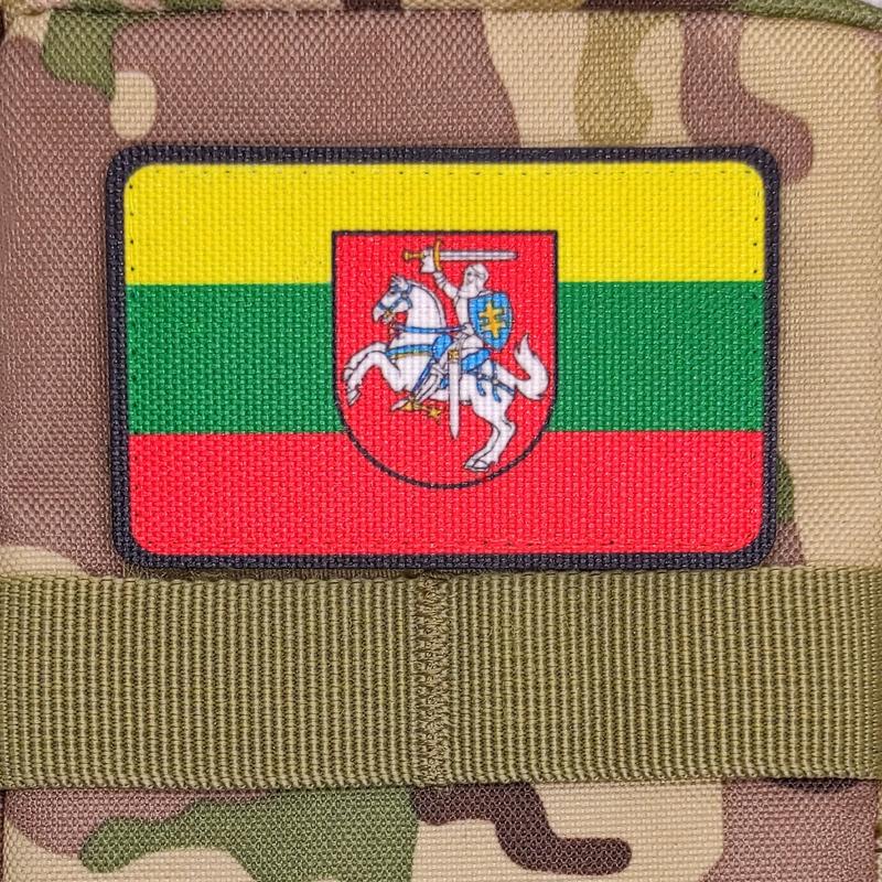 Прапор Литви з гербом, патч друкований Розмір - 8х5 см. Спосіб кріплення - липучка (велкро). Основа - тканина Оксфорд. Спосіб виготовлення - сублімаційний (водостійкий) друк. Патч прошитий по контуру. Використані водо та зносостійкі матеріали. Лазерна обробка краю.