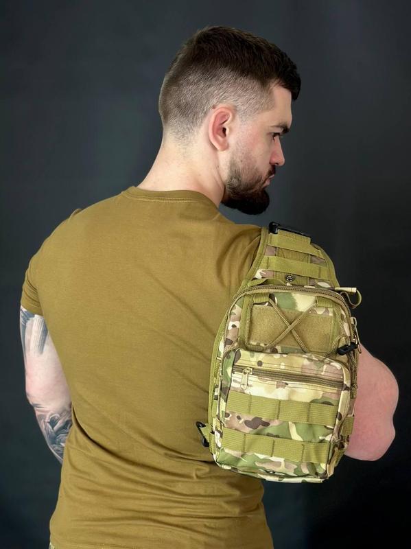 Сумка-слінг однолямкова через плече, тактичний рюкзак з кордури нагрудний олива Тактична сумка-слінг має один основний відділ та одну велику зовнішню кишеню на замку (18х18х5см). Обидва відділи мають отвори-люверси для вентиляції та відведення вологи. П'ять пластиккових кілець-кріплень дозволяють фіксувати ремінь з карабінами, відповідно до Ваших потреб, або ж за допомогою кільцевої кнопки просто трансформувати сумку в барсетку. Сумка має також коротку ручку. Система МОЛЛЕ дозволяє виконувати кріплення до бічних граней сумки, передньої частини зовнішньої кишені, а також, до клапана, що переходить в ремінь. Цей же клапан має: кишеню 10х14см з водонепрникного метеріалу (для ліхтарика, наприклад) резинку 9,5 см для кріплень Під час трансформації сумки-слінга в барсетку клапан зручно ховати в кишеню на задній частині сумки, яка виконана з тонкого паралону з сіткою для зручного контакту з тілом. Також, задня частина сумки-слінга має кріплення на липучці діаметром 4 см, або ж 6 см в натянутому замкненому стані. Верхня передня частина рюкзака має велкро-панель для кріплення шевронів чи будь-яких інших елементів на липучці. Поверх панелі-велкро навхрест натягнутий шнур-резинка з пружинним пластиковим фіксатором. Під велкро-панеллю є наскрізна кишеня. Основний відділ: пообидві стінки відділу має по одній внутрішні кишені з підкладочного матеріалу (глибина кишень 19 см і 20 см) Зовнішня кишеня: має одну внутрішню кишеню з підкладочного матеріалу (12 см на 11 см) та одну ззовні на замку. Ремінь: виконаний з ремінної стрічки (текстильна стропа) і має резинку- фіксатор, що не дає пряжці зісковзувати. Ширина - 4 см. Довжина - від 60 см до 110 см. Карабіни виконані з пластику та металу, пряжка - з пластику. Усередині сумки знаходиться: 1 основний відділ (з двома кишенями) на блискавці з двома бігунками; Ззовні і всередині зовнішньої кишені є по одній кишені; Кишеня-відділ на задній частині сумки; Невелика кишенька на частині, що переходить в ремінь; Замки-блискавки виконані з пластику, бігунки - металеві Розмір сумки: Висота - 30 см Довжина - 20 см Ширина - 15 см (основне відділення ~ 10 см + зовнішня кишеня - 5 см) Матеріал: кордура (водонепроникний міцний нейлон)