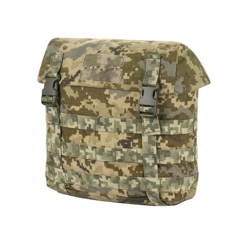 Підсумок «Сухарка» від бренду М-Тас може використовуватись як польова сухарна або штурмова сумка, розміри якої дозволять вам вмісти весь необхідний мінімум речей. Виготовлена із Cordura 500D - надміцного матеріалу, стійкого до стирання та високих навантажень. «Сухарка» закривається кришкою-клапаном за допомогою регульованих по довжині строп з фастексами від Woojin. Підсумок має одне глибоке відділення, верх якого затягується еластичним шнуром із фіксатором. Така конструкція досить продумана і захищає вміст від мимовільного випадання. Підсумок кріпиться до спорядження за допомогою Molle інтерфейса. Зверху сумки дизайнери передбачили ручку для перенесення. На клапані нашита велкро панель для кріплення патчів та ідентифікаторів. Підсумок «Сухарка» в розмірі XL призначений для перенесення різних речей та стане незамінним елементом спорядження в польових умовах.