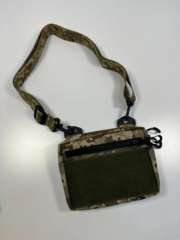 Сучасна сумка поєднує в собі стильний зовнішній вигляд і добре продуманий функціонал. Дана модель має дві кишені та одну регульовану плечову лямку. Характеристика: - одне основне відділення та одна додаткова кишеня на фронтальній частині сумки на блискавці - всередині сумки дві невеликі кишені - ззовні липучка 20х10 см (для шевронів) - Матеріал: Oxford 600D - Розмір 20х15х5 см - Довжина ременя регулюється від 70 до 130 см, ширина ременя 4 см