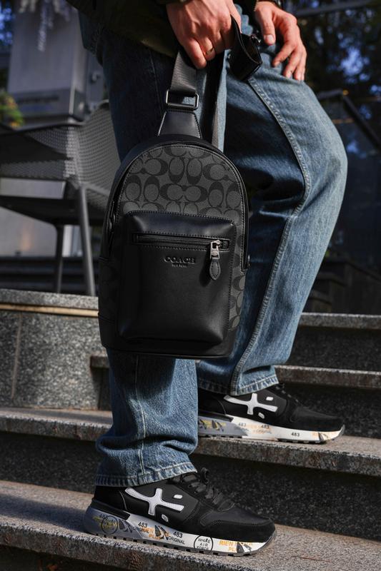 Coach West Pack In Signature Canvas/Black Матеріал: Шкіра. Сумка виконана у комбінації гладкої шкіри та текстурної шкіри з фірмовою канвою. Має одне основне відділення на застібці також спереду додаткове відділення. Всередині текстильна підкладка, маленька кишеня та шкіряна нашивка з тисненням. Фурнітура металева, брендована. Усі маркування та коди присутні. Має текстильний ремінець для носіння через плече, регулюється за довжиною, на карабіні. Комплектується у фірмову крафтову коробку на магнітах та пильовик. Накладений платіж (Післяплата). Повна оплата. наявність уточнюйте 📩