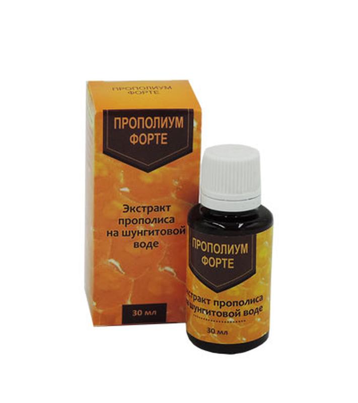 Переваги Являється прекрасним профілактичним засобом; Виводить паразитів із організму, ефективний при сильній інтоксикації; Являється єдиним засобом, який безвідмовно подіє незалежно від важкості захворювання; Покращує життєздатність клітин організму, сприяє їх оновленню; Відновлює вражений епітелій, швидко загоює рани; Водний екстракт прополісу на шунгітовій воді краще за будь-які інші засоби зупиняє навіть сильну біль; Прискорює оновлення гепатоцитів; Ефективний при гіпертонії; Знижує цукор в крові до оптимальної норми. Метод дії Різні препарати, призначені для лікування тих чи інших захворювань, діють по-різному. Екстракт прополісу Прополіум Форте являється дуже багатозадачным засобом, тому неможливо детально пояснити, як він діє, бо довелося б присвятити цій темі не одну сторінку. Ми перерахуємо вам, як він може вплинути на організм людини: Перемагає віруси будь-якої природи і небезпеки. Потрапляючи в організм, активні речовини прополісу захоплюють і нейтралізують чужерідні тіла, надаючи організму необхідні сили для відновлення; Являється імуностимулятором, підвищує захисний бар’єр імунної системи і зміцнює ослаблений імунітет; Нейтралізує дію токсичних речовин, бореться зі шлаками, холестерином та іншими речовинами, які можуть посилити хворобу; Захищає шкірні покриви від грибкових інфекцій, очищує епідерміс від будь-яких недосконалостей; Позитивно впливає на роботу серця та судин за рахунок високого вмісту в складі жирних кислот і мінералів; Прополіум Форте відновлює пошкоджену сполучну тканину,зокрема, слизові оболонки та кісткову тканину, що особливо важливо в дитячому та літньому віці. Склад водна витяжка діючих речовин прополісу (смолистої речовини, зібраної бджолами з весняних бруньок дерев і модифікованого бджолиним ферментом). Застосування Приймати 2 рази на день за 30 хвилин до їжі по 4-5 крапель на 1 ст.л. води. Курс - 30 днів.
