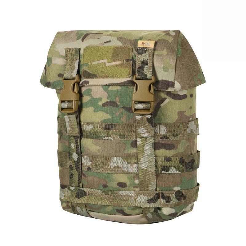 Подсумок M-Tac «Сухарка» GEN.3 Мультикам Подсумок «Сухарка» от бренда М-Тас отлично подойдет для использования в полевых условиях, а удобная конструкция позволит вместить весь необходимый минимум вещей. Изготовлена из Cordura 500D -- сверхпрочного материала, устойчивого к истиранию и высоким нагрузкам. «Сухарка» закрывается крышкой-клапаном с помощью регулируемых по длине строп с фастексами от Woojin. Подсумок имеет одно глубокое отделение, верх которого затягивается эластичным шнуром с фиксатором. Такая конструкция достаточно продумана и защищает содержимое от самопроизвольного выпадения. Подсумок крепится к снаряжению с помощью Molle интерфейса. Сзади сумки дизайнеры предусмотрели ручку для переноски. На клапане нашита панель для крепления патчей и идентификаторов. Технические детали: - Размеры: 24 х 18 х 8 см - Материал: Cordura 500D - Фурнитура: WJ (Woojin Plastic, Корея) - Система крепления: MOLLE