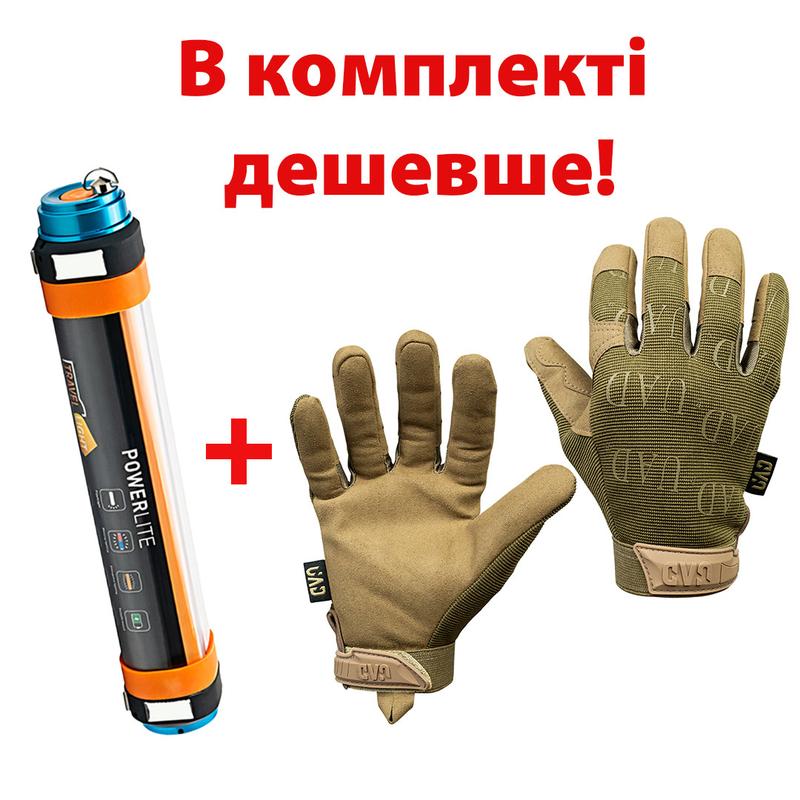 Акционный комплект: перчатки военные тактические полнопалые сенсорные ARES UAD плюс фонарик-повербанк UAD с аккумулятором на 5200 мАч. Перчатки военные тактические полнопалые сенсорные ARES UAD Перчатки модели ARES от UAD это новый этап развития тактических перчаток на рынке Украины. При разработке данной модели мы учли пожелания пользователей и операторов и сделали максимально удобные и универсальные перчатки на каждый день. Каждый палец усилен для того, чтобы ваша пара прослужила как можно больше срока. Нижняя часть перчатки закрыта прочной синтетической кожей, что продлевает срок службы перчатки и уменьшает скольжение предметов, а облегающая тыльную сторону ладони ткань улучшает посадку самой варежки на вашей руке. Такая композиция материалов помогает сохранить руки сухими и комфортными в любых условиях. Перчатки ARES подойдут как для стрельбы и работы с оружием/экипировкой, так и для повседневных работ (оборудование позиций, переноса вещей и т.д.). Цвет самых перчаток и лейб подобран так, чтобы они не отсветили при свете фонаря. Фирменный манжет UAD переработанный и усиленный – как резиновая часть, так и VELCRO. Это улучшает фиксацию перчаток на кистях. Сами перчатки оснащены небольшими петлями для быстрой фиксации перчаток на руке и возможности подвеса их на креплении карабина. Цвет данной модели – койот. Модель спроектирована в Украине. Кемпинговый фонарь-лампа повербанк водонепроницаемый с магнитом 25см UAD 5200 мАч Кемпинговый многофункциональный фонарь сочетает преимущества фонарика и повербанка. Общий аккумулятор позволяет использовать его емкость (5200 мАч) максимально эффективно в зависимости от потребностей. Фонарь имеет множество преимуществ: Влагозащищенный корпус, соответствующий стандарту IP68, то есть выдерживает погружение на глубину 1,5м. Два источника света – рассеянный (5 режимов) и направленный (1 режим). Максимальная яркость работы – 280 люменов. Режимы переключаются последовательным нажатием кнопки: 1. Первый режим – направленный свет – фонарик с торцевой стороны фонаря. Диаметр светового пятна с расстояния 1 метр – 10 см. яркая область плюс 1 метр рассечна. Последующие режимы включают рассеянный свет (боковая лампа): 2. Рассеянный свет Low - мощность 8% от максимума, до 60 часов работы. 3. Рассеянный свет Medium – мощность 30% от максимума до 16 часов работы. 4. Рассещенный свет Max – 100% мощности до 8 часов работы. 5. Рассеивающий свет Flesh – желтый свет, который отлично освещает несмотря на слабый световой поток. Мощность 8% от максимума, более 60 часов работы. 6. Режим Caution – мигание двух цветов – красного и синего. Аварийный режим виден с большого расстояния. Работает до 60 часов. Зажим кнопки на 2 секунды отключает фонарь независимо от режима. Фонарь имеет usb выход, как обычный повербанк. Его можно использовать для зарядки всех бытовых приборов. На корпусе фонарь