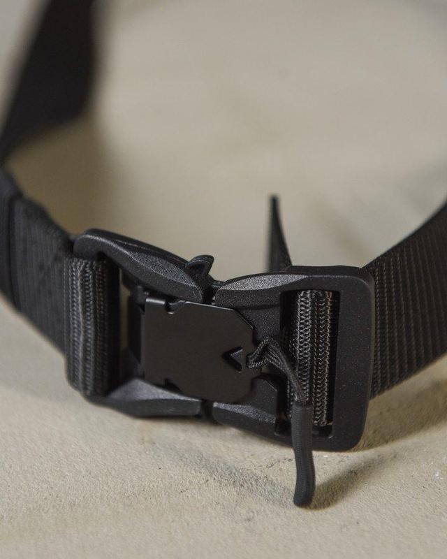 Оснащен изготовленной из цинка магнитной разъемной пряжкой типа "Питон", напоминающей змеиную голову. Это быстроразъемная пряжка. Для того, чтобы ее закрыть или открыть, требуется всего одна секунда. В полевых условиях это очень удобно. Замок способен выдержать силу 1,4 кН, при этом сам ремень способен выдержать 2,4 кН. Это более двух тонн. Пояс изготовлен из полиамидной стропы, что делает его очень крепким и долговечным, способным выдержать большие нагрузки практически без деформации. Пояс имеет резиновый тренчик, надежно удерживающий свободный конец ремня. Характеристики: Размеры: 125×3,8 см Масса: 130 гр Материал: полиамид Цвет: черный
