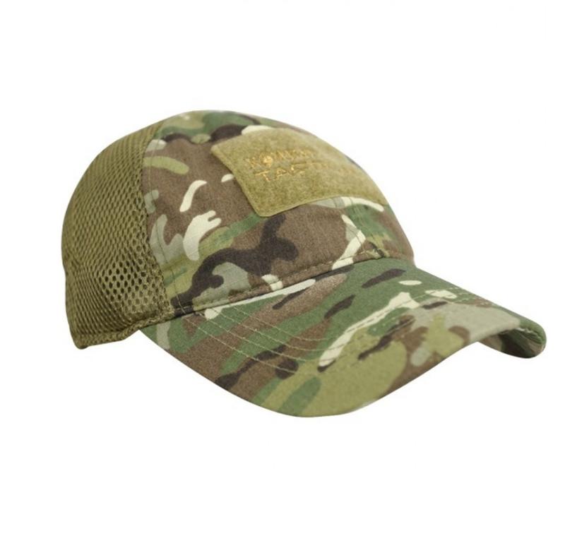 Кепка KOMBAT MESH Operators Cap мультикам Бейсболка відмінно захищає голову від переохолодження. Вона користується популярністю серед мисливців, рибалок та любителів активного відпочинку на природі. Жорсткий козирок захищає очі від попадання прямих сонячних променів. Кепку можна сміливо використовувати восени, взимку або ранньою весною. • 3 нашивки на липучках і вишивка Kombat Tactical на передній панелі на липучках • Сітчаста вентильована задня частина • Матеріал: полікоттон ріпстоп