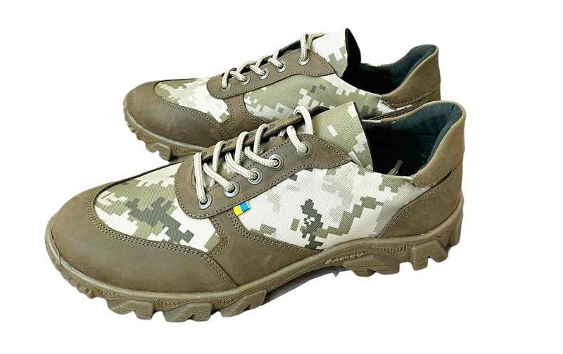 Тактические мужские кроссовки под форму для ЗСУ (камуфляж пиксель) - практичные и надежные, воздухопроницаемые. Материал верха: Натуральная кожа в комбинации с водонепроницаемой тканью цвета пиксель камуфляж. Материал подкладки: Сетка текстильная Стелька: Сетка текстильная с пенкой «memory» Подошва: Термопластический материал с мощный цепкий протектором Производитель: Украина Сезон: весна/лето Детальная информация: - Данная модель подойдет для лета, так как имеет камуфляжные вставки, которые обеспечат лучшую циркуляцию воздуха и будут поддерживать необходимый внутренний микроклимат. - Основной материал - это высококачественный натуральный нубук, который обладает отличными воздухопропускными свойствами, прочностью и износостойкостью. - Прочная шнуровка надежно фиксирует обувь на ноге, что предотвращает вывих и защищает связки. - Протекторная подошва обеспечивает максимальный комфорт при ходьбе на местности с разным рельефом и видами грунта. - Розмір: 44 - 30 см