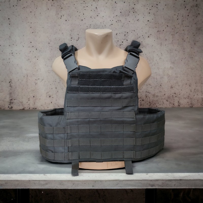 Плитоноска из прочного водоотталкивающего материала, дублированая (подвоенная, для прочности). Боковые части имеют карманы для пластин. Оснащена, спереди и сзади, системой MOLLE. Плечевые лямки оснащены системой быстрого сброса - фастекс. На плечевых накладках есть специальные стопора (подушечки). На задней части опоясывающей детали есть резинка, обеспечивающая амортизирующее действие при плотном прилегании. Регулируется по высоте и ширине.