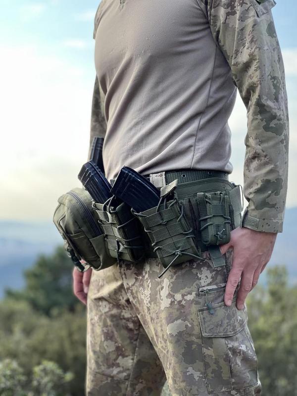 - 4 підсумки для магазинів АК - підсумка для гранати - підсумок для аптечки. Розгрузка дуже якісна та зменшує навантаження на спину, всі підсумки надійно тримаються на системі MOLLE на 2 стропи. Всі підсумки можливо перевішувати. Об’єм універсальний Регулюється завдяки реміню. Тканина :CORDURA 1000