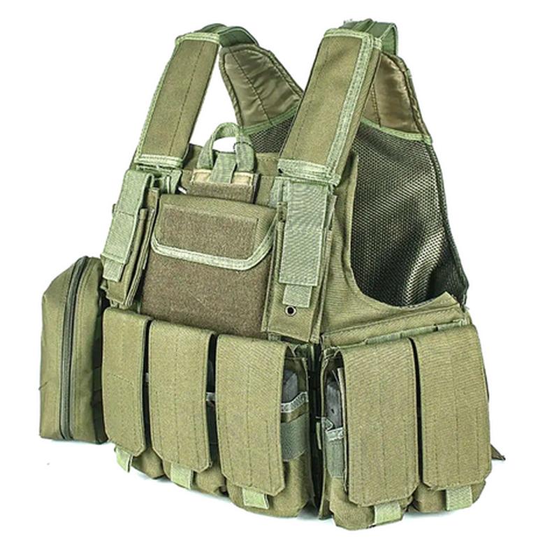 Система швидкого скидання, п'ять закритих підсумків для великих магазинів та одна сумка-аптечка. На грудях є центральна сумка-кишенька та два малих підсумки для пістолетних набоїв з обох боків. Система кріплення MOLLE. Підходить під плити розміром 30*25*2,5 см. Матеріал: 600D Oxford еластичний водонепроникний Розмір плитоноски: 52*45 см Вага: 1,8 кг
