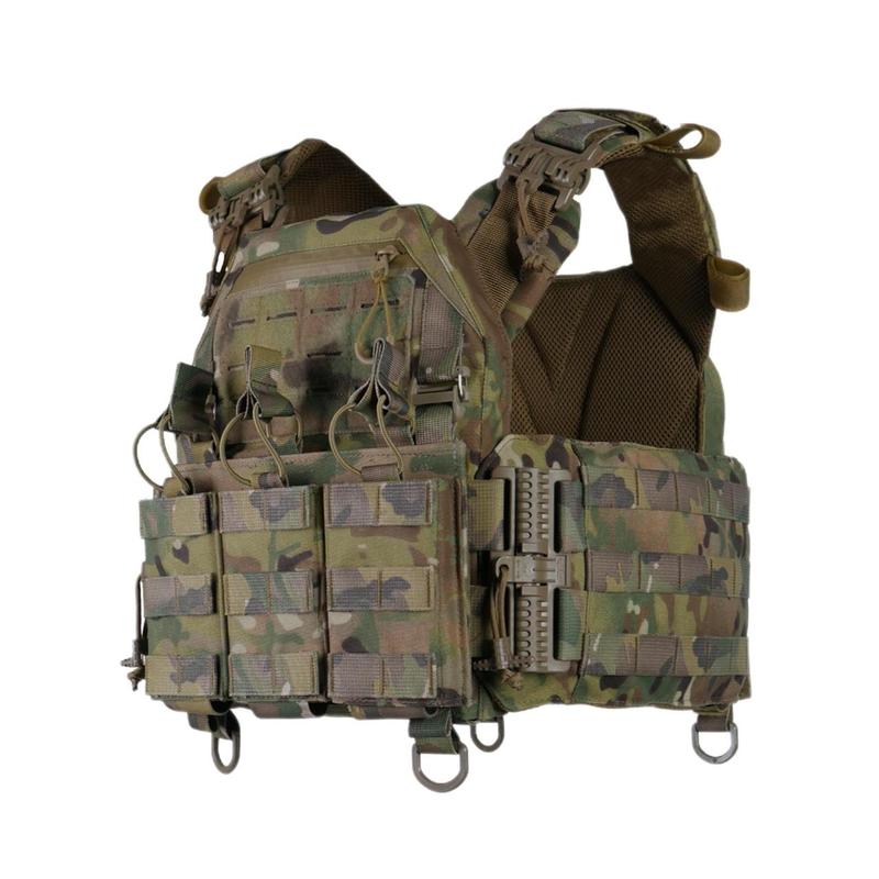 В комплекті Плитоноска швидкого скидання CEN.2. 1 шт Швидкоз'ємна панель для 3 або 6 магазинів 1 шт Плитоноска оснащена з’ємною передньою Molle панеллю яка кріпиться до основи на Velcro та додатково двома карабінами Woojin. На ній зручно розміщуються 3 підсумки під 1 або два магазини, або інше Molle-сумісне спорядження. Цю панель можна швидко замінити на іншу із закрікленим на неї заздалегідь набором потрібних підсумків. Матеріал Cordura Nylon 6.6 1000D з NIR-просоченням Плити 25*30 см Бокові кармани під балістичні пакети 13,5*30,5 см. Характеристика плитоноски Матеріал: Виготовлена з Cordura Nylon 6.6 1000D з NIR-просоченням, що забезпечує виріб меншу помітність у приладах нічного бачення. Тканина має подвійне поліуретанове покриття для захисту від вологи та мастильних матеріалів, не підтримує горіння, не стирається, не вигорає на сонці. Сумісність: Підходить для бронеплит розміром 25*30 см зі скошеними верхніми кутами і товщиною до 30 мм (металеві або керамічні). Бокові кишені: Оснащена кишенями під балістичні пакети 13,5*30,5 см. Система Molle: Плитоноска має велкро панель з Luser Cut Molle на верхній частині, а також чотири ряди строп Molle на фронтальній частині та три ряди строп Molle на камербандах. Елементи захисту: Підходить для установки балістичних пакетів першого або другого класу від компанії Militex. Швидке скидання: Має подвійний механізм швидкого скидання в зоні плечей та камербандів для швидкого зняття плитоноски. Комфорт: Має ергономічні плечові лямки з м’яким демпфером та 3D-сіткою для більшого комфорту і правильного розподілу навантаження. Додаткові функції: Регульована система по довжині та об'єму. Д-кільця спереду та ззаду для кріплення додаткового спорядження. Велкро панель для розміщення патчів, Molle-спорядження та невеликого адміністративного відділення. Демпферні вставки: Внутрішня частина плитоноски має демпферні вставки обшиті 3D-сіткою для амортизації та правильної циркуляції повітря. Камербанди: З'ємні, з м'якими демпферами обшитими 3D-сіткою та кишенями під балістичні пакети 13,5*30,5 см Евакуаційна ручка: Ручка для евакуації, яка фіксується до спинки велкро- панелями. Ця плитоноска має високий рівень функціональності та надійності для захисту користувача в різних умовах.