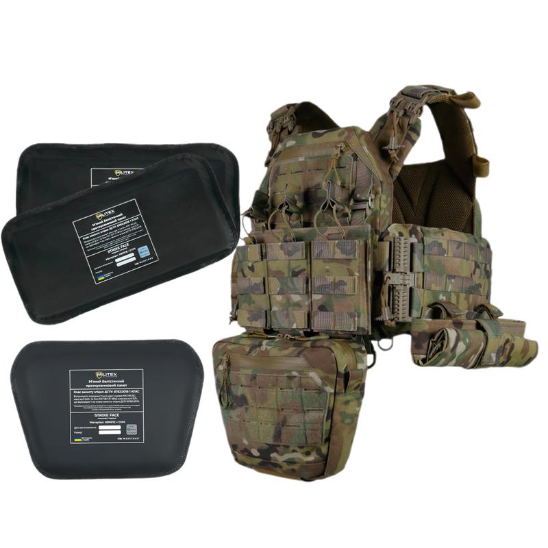 В комплекті -Плитоноска швидкого скидання CEN.2. 1 шт -Швидкоз'ємна панель для 3 або 6 магазинів 1 шт -Напашник XL з карманом під балістичний пакет 1 шт -Підсумок для скидання магазинів 1 шт -Підсумок утилітарний мультикам 1 шт -Балістичний пакет 1 класу Militex для напашника XL 25,5*16*17 чорний 1 шт Балістичний пакет в боковий карман Militex 12×30 1 класу -чорний 2 шт Плитоноска оснащена з’ємною передньою Molle панеллю яка кріпиться до основи на Velcro та додатково двома карабінами Woojin. На ній зручно розміщуються 3 підсумки під 1 або два магазини, або інше Molle-сумісне спорядження. Цю панель можна швидко замінити на іншу із закрікленим на неї заздалегідь набором потрібних підсумків. Матеріал Cordura Nylon 6.6 1000D з NIR-просоченням Плити 25*30 см Бокові кармани під балістичні пакети 13,5*30,5 см. Характеристика плитоноски Матеріал: Виготовлена з Cordura Nylon 6.6 1000D з NIR-просоченням, що забезпечує виріб меншу помітність у приладах нічного бачення. Тканина має подвійне поліуретанове покриття для захисту від вологи та мастильних матеріалів, не підтримує горіння, не стирається, не вигорає на сонці. Сумісність: Підходить для бронеплит розміром 25*30 см зі скошеними верхніми кутами і товщиною до 30 мм (металеві або керамічні). Бокові кишені: Оснащена кишенями під балістичні пакети 13,5*30,5 см. Система Molle: Плитоноска має велкро панель з Luser Cut Molle на верхній частині, а також чотири ряди строп Molle на фронтальній частині та три ряди строп Molle на камербандах. Елементи захисту: Підходить для установки балістичних пакетів першого або другого класу від компанії Militex. Швидке скидання: Має подвійний механізм швидкого скидання в зоні плечей та камербандів для швидкого зняття плитоноски. Комфорт: Має ергономічні плечові лямки з м’яким демпфером та 3D-сіткою для більшого комфорту і правильного розподілу навантаження. Додаткові функції: Регульована система по довжині та об'єму. Д-кільця спереду та ззаду для кріплення додаткового спорядження. Велкро панель для розміщення патчів, Molle-спорядження та невеликого адміністративного відділення. Демпферні вставки: Внутрішня частина плитоноски має демпферні вставки обшиті 3D-сіткою для амортизації та правильної циркуляції повітря. Камербанди: З'ємні, з м'якими демпферами обшитими 3D-сіткою та кишенями під балістичні пакети 13,5*30,5 см Евакуаційна ручка: Ручка для евакуації, яка фіксується до спинки велкро- панелями. Ця плитоноска має високий рівень функціональності та надійності для захисту користувача в різних умовах. Балістичний пакет 1 класу Militex для напашника XL 25,5*16*17 чорний Балістичний пакет Militex 12×30 1 класу чорний Балістичні пакети від Militex створені для надійного захисту від пістолетних куль, дрібних уламків та вторинних вражаючих елементів. Вони складаються з м’яких, гнучких та легких панелей різної форми. Основні матеріали, використані в пакетах Militex, включають: Надвисокомолекулярний поліетилен високої щільності (UHMWPE) бренду Dyneema®️, що відомий своєю стабільною якістю. Синтетичний нетканий матеріал (Кевлар) як додатковий демфер для зниження позаперешкодної травми. Чохол з водонепроникної тканини з поліуретановим покриттям, забезпечуючи надійність та якість. Процес виробництва включає точну лазерну порізку балістичних матеріалів та ультрозвукову запайку країв чохла. Бронепакет MILITEX витримав постріли: - пістолетною кулею калібру 9х18 мм (швидкість 341±1 м/c) зі с