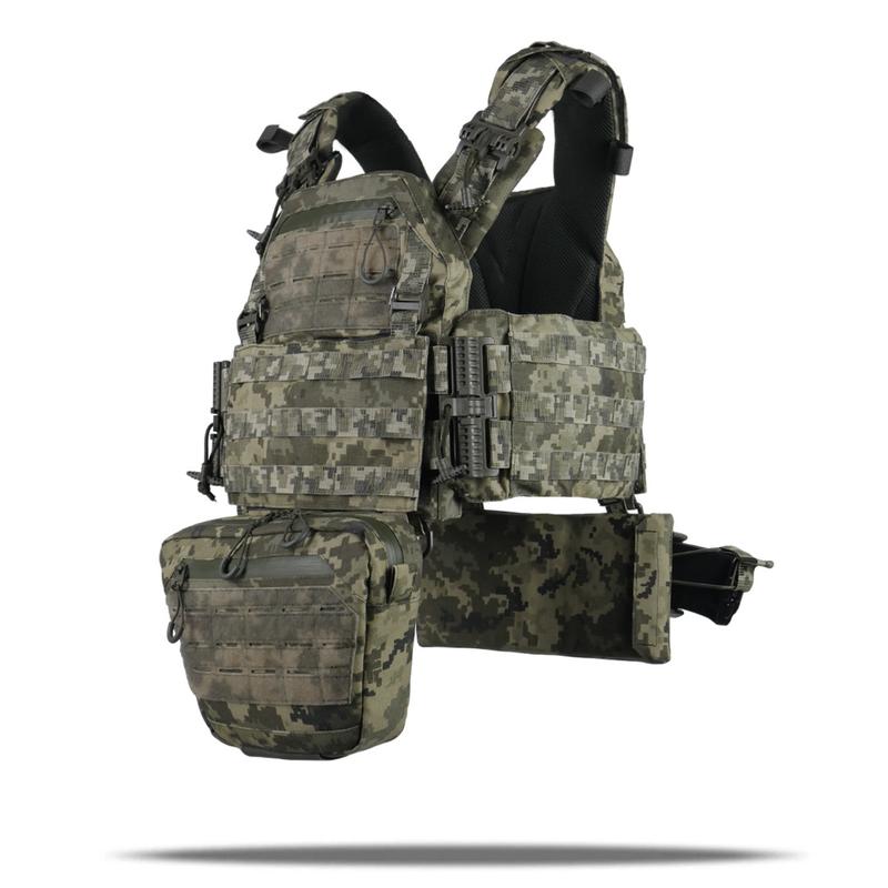 Плитоноска GU gen.2 + 2 Totals з балістичним захистом класу 1 піксель Набір складається з: плитиноска GU gen.2 Multicam Plate Carrier - XL GU Cordura Multicam Saddle Bag; · · Захист попереку для балістичного пакету Militex Multicam; - балістичний пакет Militex для XL 25,5*16*17 (1 клас захисту); - Балістичний пакет Militex для захисту живота/попереку 30,5*13,5 (1 клас захисту) Плитоноска GU gen.2 – це нове покоління індивідуального бронезахисту в лінійці GU (Glory to Ukraine). Сумісний зі стандартними бронепластинами 25х30 зі скошеними верхніми кутами (металевими або керамічними товщиною до 30 мм). Плитоноска оснащена знімною передньою панеллю Molle, яка кріпиться до основи за допомогою липучки та двох додаткових карабінів Woojin. Він зручно вміщує 3 тотал на 1 або два магазини, або інше обладнання, сумісне з Molle. Цю панель можна швидко замінити на іншу, заздалегідь замкнувши на ній набір потрібних підсумків. У верхній частині, над клапаном, розташована посилена панель Velcro з Luser Cut Molle, яка дозволить розмістити не тільки улюблені нашивки, а й Molle-сумісне спорядження, наприклад, адміністративний тотал, або кріплення для телефону, та невелике адміністративне відділення (кишеню) на водонепроникній блискавці зі зручним пуллером для зберігання дрібних плоских предметів, таких як ідентифікатори, ключі, запальнички тощо. шиються нитками зигзагоподібними швами Tytan на спеціальній схоплювальній машині, що гарантує міцність і довговічність таких швів. Подвійна швидкознімна система в області плеча і камербанда дозволяє скинути плитоноску за лічені секунди, просто потягнувши за паракорд. Завдяки швидкознімним механізмам плитоноска одягається швидко і комфортно. Основна тканина - Cordura Nyl**********г/м² з NIR-просоченням, що робить виріб менш помітним в приладах нічного бачення. Має подвійне поліуретанове покриття для захисту від вологи та мастил, не підтримує горіння, не стирається, не вигоряє на сонці, довго зберігає свої властивості в екстремальних умовах експлуатації. Внутрішні частини плитоноски мають чотири демпферні вставки, обшиті 3D сіткою товщиною 3 мм, що забезпечує амортизацію та правильну циркуляцію повітря. Верхні ергономічні плечові лямки з м'яким демпфером і 3D сіткою органічно повторюють контури тіла, правильно розподіляють навантаження і не тиснуть занадто сильно на плечі. На лямках є система регулювання по довжині (розміру), повноцінні стропи Molle для кріплення додаткових підсумків, найчастіше турнікет або рація і додаткові кріплення для трубки гідратора. М'які подушки повністю закривають пластикові швидкознімні пряжки, що запобігає натиранню під час носіння. Камербанди повністю знімні, м'які демпфери обшиті 3D сіткою. Заслінки не цільні, а розділені на п'ять частин для більшої гнучкості самого камербанда і кращої циркуляції повітря. Камербанди кріпляться до плитоноски з двох сторін за допомогою великих велкро-панелей, що дозволяє швидко і зручно регулювати розмір (обсяг). На тильній стороні камербандів є вставки у вигляді подвійної гумки 100мм для додаткової еластичності. Камербанди мають 3 ряди строп Molle для кріплення підсумків та кишеню для балістичних сумок, балістичний пакет 1-го або 2-го класу від Militex, який можна придбати у нас разом із плитоноскою. Передня частина плитоноски має чотири ряди з панеллю Molle та Velcro, з Luser Cut Molle, посиленою зсередини стропою для Molle-сумісного спорядження та ідентифікаційними нашивк