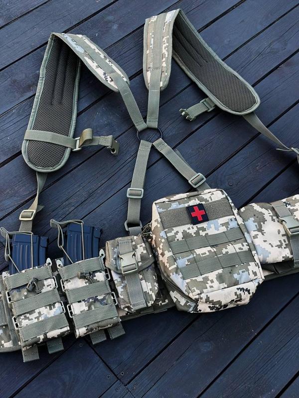 Комплект РПС з ремнем на фастексі, плечова система та 6 підсумків До комплекту входять: -РПС та ременем; -підсумок під аптечку; -сумка для скиду; -підгранатник; -каркасні підсумки під магазини, 3 шт; -плечова система. Довжина ременя регулюється від 125 см до 95 см,ширина 5 см. Розмір підкладки 90х15 см РПС оснащений кріпленнями ремнем на фастексі з системою "Lock". Ремінь змінний. В середину вшита помякшуюча підкладка що слугує додатковим демфером. РПС оснащений дихаючою 3D сіткою з внутрішньої сторони,що робить його більш комфортнішим у використанні. Зовнішня сторона оснащення системою моллі з міцної та надійної поліамідної стропи, для кріплення підсумків та іншого додаткового спорядження. Для пошиву використовується щільна, водовідштовхувальна тканина Кордура 900D. Все прошито армованими нитками, що підвищує термін служби виробу. Колір: мультикам, олива, піксель.