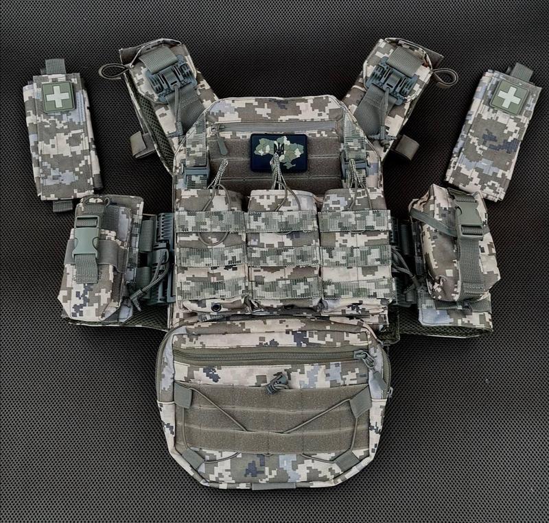 Увага важлива інформація Все що в Комплекті можливо замовити окремо До комплекту входять: -Плитоноска GEN.9; -Тройний підсумок під АК; - підсумок під турнікет 2шт; - підсумок під гранату 1 шт; - підсумок під рацію 1 шт ; - напашник 1 шт; - шеврон 1 шт; - шеврон медичний хрест 2 шт; Під плиту 25×30 см Має 4х точечну системою швидкого скидання та бокові кишені під балістичний пакет 15×30см -Зʼємна передня Molle панель яка кріпиться до основи на Velcro та двома карабінами -Кишеня на вологозахисній блискавці -Регулюється на плечах та по об'єму -Внутрішня частина оснащена 3D сіткою -Кріплення для трубки гідратора -Посилена евукаційна ручка -Камербанди з’ємні,кріпляться з обох сторін до плитоноски за допомогою великих велкро-панелей -На задній частині камербандів вставки у вигляді подвійної резинки -З низу плитоноски 4D-кільця -Виготовлена з міцної, водонепроникної тканини Кордура 900D -Надміцна поліамідна стропа -Армована прошивка