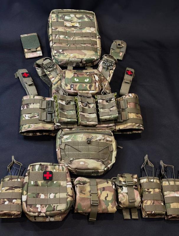 Обращаем Ваше внимание, что фурнитура может отличаться, в зависимости от партии поставки. В комплект шеврони не входять Плитоноска 1 шт Подсумок для АК магазинов с пластиковыми боками 3 шт Рюкзак 1 шт Подсумок для телефона 1 шт Подсумок под правый 1 шт Горизонтальное подсумка для плитоноски 1 шт Подсумок для турникета 2 шт Напашник 1 шт Подсумок для магазинов АК 3 шт Аптечка 1 шт Подсумок для сброса магазинов 1 шт Подсумок под гранату 1 шт РПС Кобра без плечей 1 шт боковые карманы под мягкие баллистические пакеты 15*30 см Качественная плитоноска по стандарту НАТО оснащена боковой и верхней системой быстрого сброса, под плиту 25×30 см. - Размер плитоноски универсальный, регулируется на плечах и по объему от М до XXL. - С середины прошита 3D сеткой и смягчающей подкладкой, что служит дополнительным демпфером. - Сзади оснащена эвукационной ручкой. - По верху прошита системой Molle, позволяющей крепить любые подсумки и другое дополнительное снаряжение. - По переду вшит дополнительный карман на молнии для личных нужд. - Бронеплиты вставляются снизу и фиксируются широкой системой липучек, что не позволит вашим плитам выпасть или протереть крепления. Изготовлена из прочной, водонепроницаемой ткани кордура. Для пошива используется полиамидная стропа. Для ее изготовления используется устойчивый к износу, супер прочный, высококачественный полиамид. Обладает отличными свойствами: высокий уровень прочности, надежная, сможет выдержать большие нагрузки, устойчива к негативному воздействию ультрафиолета, влаги, высоких/низких температур, долговечна. Соответствует требованиям отечественных стандартов качества. Плитоноска прошита армированными нитями, что повышает срок службы изделия. Компактный и легкий рюкзак является незаменимым элементом экипировки профессиональных военных. Выполнен полностью из прочного, водонепроницаемого материала оксфорд 600d. Основные характеристики: • размер (см): 25/30/10 • крепление на системе MOLLE • имеет в середине 2 объемных кармана • может использоваться как рюкзак для гидросистемы. • имеет велкро панель для креплений шевронов и патчей. • закрывается на молнию. • дополнительные стропы MOLLE спереди. • усиленные швы • армированные нити